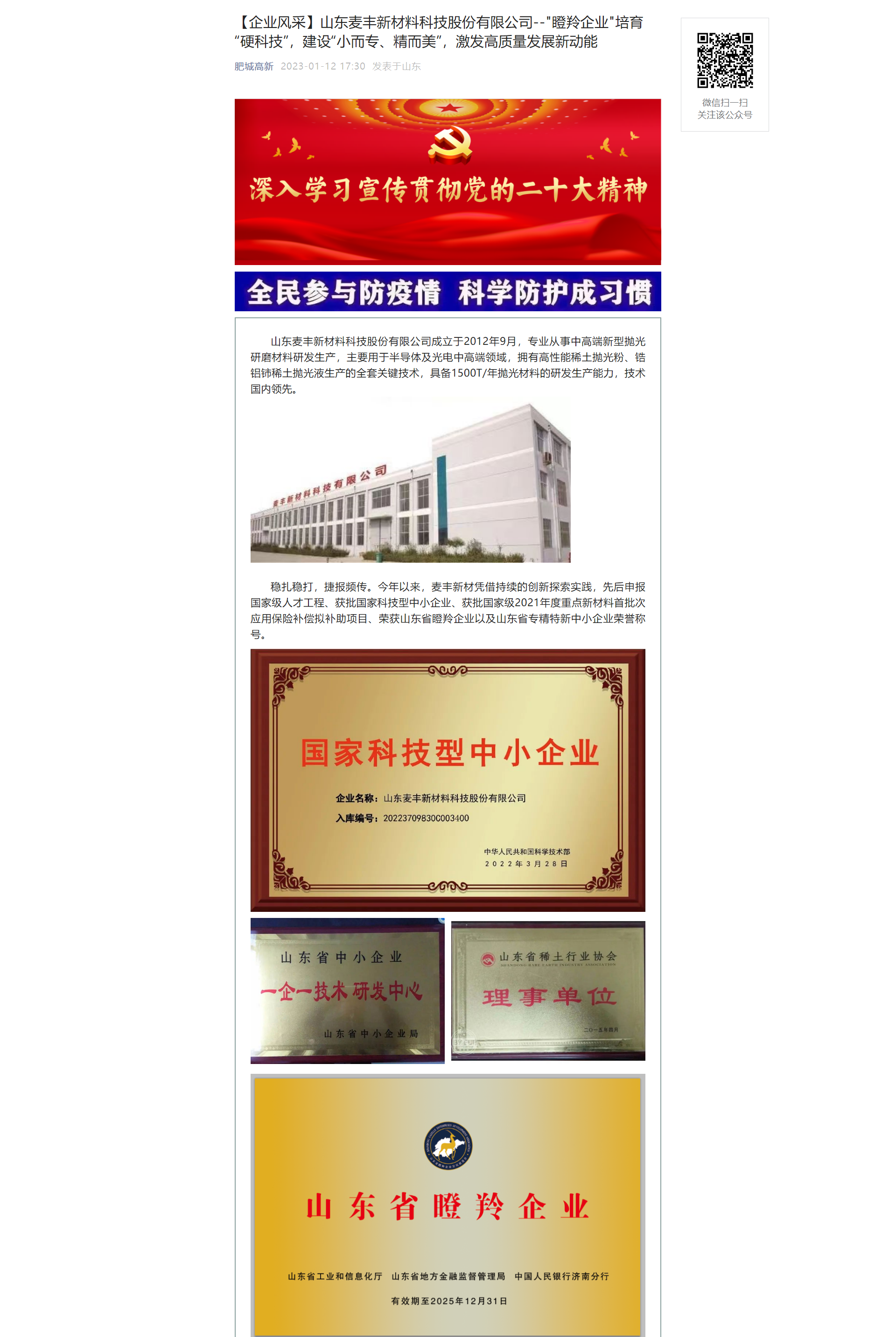 肥城高新公眾號刊發(fā)《山東麥豐新材料科技股份有限公司"瞪羚企業(yè)"培育“硬科技”,建設(shè)“小而專、精而美”,激發(fā)高質(zhì)量發(fā)展新動能》文章